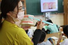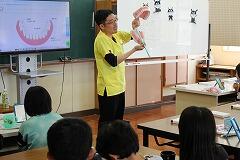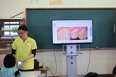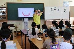 先日全学年対象の歯科検診があり、その後本校の学校歯科医であるいちご歯科の先生に歯の健康指導を行っていただきました。わかりやすいむし歯ができる動画を見せていただき、 3・4年生は口の中がすごく気になる様子でした。動画のおさらいを兼ねて先生から1gの歯垢(プラーク)にどれくらいのばい菌がいるのかクイズがありました。答えは1000億以上でしたが、その多さにまたまたびっくりしていました。先生から説明を受けて、早く歯磨きがしたい子どもたちは、先生の話を食い入るように見ていました。ブラッシング指導では、画像にありますように歯科衛生士さんと協力して、大きな歯の模型に歯ブラシを当てる方法や磨く順番等を丁寧に教えてくださいました。歯科医の先生の子どもたちの心に響く指導のおかげにより、手鏡をもちながら自分の歯を大切に磨いているかしのっ子の姿が大変印象的でした。