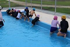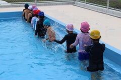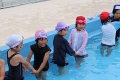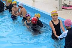 本日は、1・2年生のプール開きが行われました。水着に着替える指導を教室で行い、その後新しくなった小プールに移動しました。準備運動、シャワーを行い、いよいよ入水です。2年生がすべてお手本を見せてくれるので、反対に座っている1年生は行動が大変わかりやすそうでした。2人組のバディで一緒に肩まで水に沈んだり、ジャンプしたりと次第に水慣れしてきました。次は、じゃんけん列車を行い、負けた人が後ろに連なり、最後は長い一列の列車になりました。そのままプールの際を1・2年生の列車がどんどん走り始め、途中からプールの水が渦のように流れをもち、みんなが手を離して流れに身をまかせたり走ったりしました。かしのっ子たちは、楽しさのあまり賑やかな声が運動場まで響き渡りました。最後は、2年生がバタ足の泳ぎを披露して楽しいプール開きを終えました。