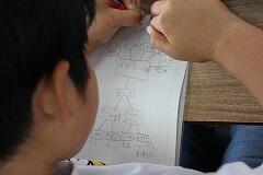 4年生は、 これまでに乾電池の数やつなぎ方(直列つなぎ・並列つなぎ)を変えると、電流の大きさや向きが変わり、豆電球の明るさやモーターの回り方が変わることを学習していました。今日は学んだことを活かして、プロペラが早く回るように直列つなぎの回路を搭載したプロペラカーを作成していました。タイヤを切り離したり、車のボディにシャフトを取り付けたりと説明図を読みながら完成を目指していました。特に、ショート回路を作らないということについて、子どもたちは乾電池の向きと回路をしっかりとたどりながら確認している様子がうかがえました。