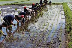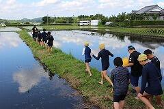 先週13日(木)に田植えを始める前の水田を使って、どろんこドッヂボールを行いました。それから1週間後の本日、5年生は、庄内地区のJA青年部の皆様の協力により田植え活動を行いました。昨日の雨とは、打って変わってのジリジリとした日差しの下で苗を小さくちぎりながら植えは始めました。JA青年部の方、保護者の方の手ほどきを受けながら植えていました。お手伝いで田植えの経験のある児童は、決められた場所をあっという間に植えます。初めての児童は、苗をちぎり取るところから苦労していました。しかし、いくつか植えるとすぐに慣れてきて、ピンクの植える目印の付いたひもの移動が徐々に早くなってきました。ご覧のように水田の5分の2を30分ほどで植えることができました。時間の関係で、残りは機械による田植えになっしまいましたが、先週から素晴らしい自然体験をさせていただきました。ありがとうございました。