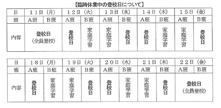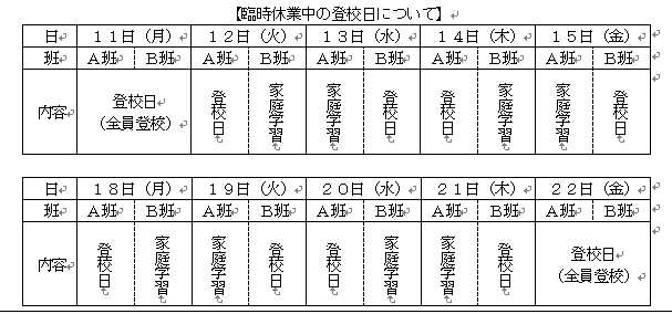 ※ 分散登校の班及び登校日等につきましては、5月11日(月)の全員登校日にお知らせいたしま