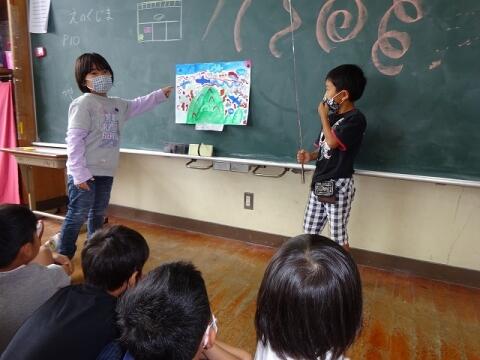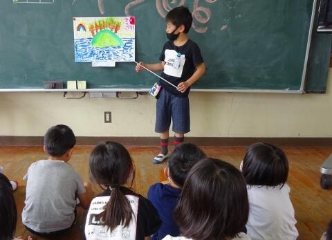 作品を描き終えた後は、「作品紹介コーナー」を開催し、それぞれの「えのぐじま」について熱く語ってもらいました。友達の作品紹介を聞いて、「○○のところがかっこいいね」「○○を点で描いているところがいいね」など、進んで感想を述べることができました。