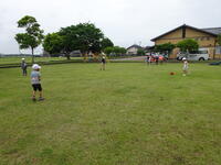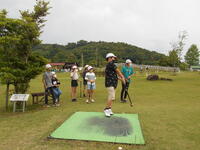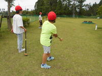 山田パークゴルフでは、まずクラブの持ち方や、ボールの打ち方を教わりました。最初は何回打っても、なかなか思う方向にボールがとびません。しかし、そこはさすが菓子野の高学年です。何度も打つ内にこつを覚えたのか、4~5回でボールが入るようになりました。中には、2回打ってボールが入った上手な子もいたようです。