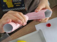 5年生が図工「コロがるくんの旅」で、チョキチョキと紙を切っていました。よく見ると、紙に切り込みを入れています。それらをうまく組み合わせて、ボールが転がるコースを作っていました。