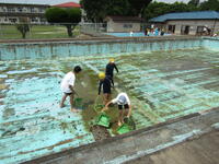 5・6校時、3~6年生の約60名でプール清掃をしました。大プールや小プールの他、足洗い場、更衣室、トイレなどをきれいにしました。プールには1年分のよごれがたまっていて、落ち葉やプール底のぬめりを取るのが大変でした。掃除が終わった後は、プール全体がきらきら光って見えました。みんなのがんばりのおかげです。