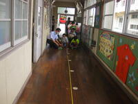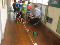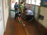 3年生の理科「風とゴムの力のはたらき」では、風の力やゴムの力を学習します。今日は、職員室前の廊下を使って、車が動く距離を測りました。