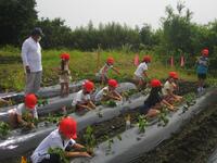 今年も地域の方の畑をお借りして、全校児童でさつまいもを育てます。畑の耕運、マルチはり、苗の提供まで地域の方々に協力していただきました。今日の苗植えには、植え方のレクチャーまでしていただきました。