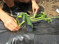 苗の植え方には、順番がありました。まず、ビニールの上に20cm間隔の穴をあけます。次に、空いた穴に寝かせるように苗を置きます。このとき、3~4節が土に埋まるようにするのがコツです。最後に、上から土をかけます。