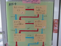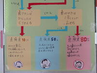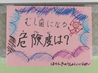 保健室前の廊下に、保健給食委員会が作成した掲示物がありました。タイトルは、「むし歯になる危険度は?」です。「あまいものがすき?」という質問に「はい」か「いいえ」で答えるところから始まります。いつくかの質問の結果、むし歯になる危険度が分かるものでした。