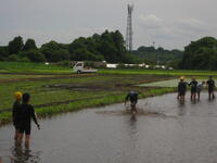 JA庄内青年部や地域のボランティアグループ、菓子野小の方など20名あまりの方々に、丁寧に指導をしていただき、交流を図りながら楽しく稲の苗を植えました。手植えで1時間超、やっと田んぼ一面の田植えが終わりました。