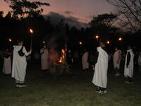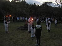 夕飯が終わると、待ちに待ったキャンプファイヤ―です。広場に移動して、焚火を囲んで座りました。各学校の出し物を10分ほどずつ披露しました。菓子野小の出し物は、運動会で披露したダンスや、学校紹介クイズです。笑いを入れつつ、自信をもって発表する姿、かっこよかったです。
