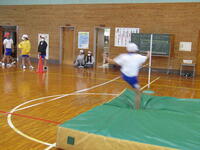 いきなり固いハードルだと怖いので、練習ではゴム紐をバーの代わりとして使いました。初めは、歩幅がうまく合わず、難しそうでした。しかし、「1、2、123。」というリズムに合わせて跳ぶと、リズムよく跳べました。記録も徐々に伸び、80cm近くを跳べるようになりました。