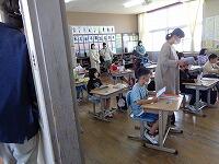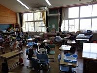 4年生は、国語辞典を使っての学習でした。先生が黒板に書いた漢字を見つけるスピードをグループで競い合っていました。早く見つけた人が同じグループの人のそばに行き教えていました。