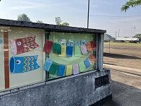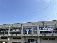 玄関前掲示板と体育館の窓に運動会のスローガンが掲げてあります。