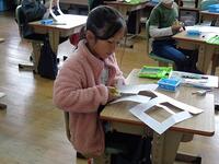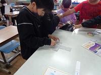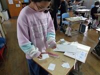 2年生が、算数科「はこの形」の学習で石けん箱の面を写し、切り取っていました。面の数を具体物を使って実感する学習でした。