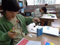 4年生が、算数科「直方体と立方体」の学習で各々で立体を作っていました。具体物を使って見取り図や展開図につながる学習でした。