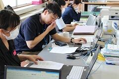 5年生が、理科「種子が発芽する条件」の実験結果を確かめている様子です。「温度が低温と常温」の条件のみ変えて、他の条件はそろえて実験結果を確かめている様子です。トウモロコシとインゲン豆2種類とも低温の方が発芽していない結果に、予想と比較して納得していたり驚いていたりの様子がうかがえました。次に6年生は、校内のお気に入りの場所をタブレットで撮影し下描きをしていました。タブレットの写真には9分割の線が引いてあり、画用紙も同様の薄い線がありました。この画面を分ける線は、風景を描きやすくするための工夫だったようです。最後に、4年生が校内の樹木を描いていました。ここでも図工室のテーブルにはタブレットが一人ずつあり、自分が描きたい樹木の写真が表示してありました。