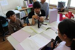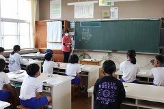 5年生は社会科で日本各地の気温と降水量の違いをグラフから読み取っていました。班ごとに調べたい都市のグラフを選択し、その特徴を発表していました。冬に降水量が多い都市、年間をとおして気温が高い都市、冬に降水量が少ない都市など自分たちが調べたことを大型テレビに映しながら発表していました。赤い枠で囲んでいるところは、発表の時に児童のタブレットから大型モニターに画像を転送して発表している場面です。児童は、自分のまとめたことをワイヤレスで簡単に大型モニターに映していました。