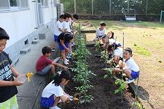 いよいよ明日は、運動会です。2校時に教室をのぞいてみると2年生が生活科で植えた自分の野菜に水をたっぷりとあげたり、ミニトマトの脇芽を摘んだり、支柱を立てたりとお世話を一生懸命にしていました。すくすくと育っている様子にうれしそうな2年生の顔が印象的でした。
