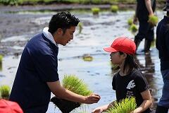 先週13日(木)に田植えを始める前の水田を使って、どろんこドッヂボールを行いました。それから1週間後の本日、5年生は、庄内地区のJA青年部の皆様の協力により田植え活動を行いました。昨日の雨とは、打って変わってのジリジリとした日差しの下で苗を小さくちぎりながら植えは始めました。JA青年部の方、保護者の方の手ほどきを受けながら植えていました。お手伝いで田植えの経験のある児童は、決められた場所をあっという間に植えます。初めての児童は、苗をちぎり取るところから苦労していました。しかし、いくつか植えるとすぐに慣れてきて、ピンクの植える目印の付いたひもの移動が徐々に早くなってきました。ご覧のように水田の5分の2を30分ほどで植えることができました。時間の関係で、残りは機械による田植えになっしまいましたが、先週から素晴らしい自然体験をさせていただきました。ありがとうございました。