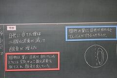 6年生は、植物の葉に日光が当たると養分(でんぷん)ができることを実験で調べていました。今日は、日光が当たっていない植物の葉にでんぷんがあるかどうかを実験の手順を確認しながら確かめていました。各班ごと植物の葉を慎重にお湯 につけ、ろ紙に挟んででんぷんをたたき出していました。ヨウ素液を垂らすと予想通り反応がなかったのを見て、やっぱりできないんだと納得していました。雨が続く中ですが、次の時間は日光が当たった葉を使って実験を行います。