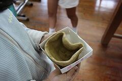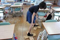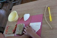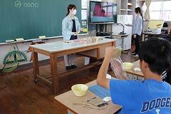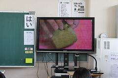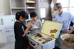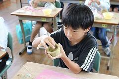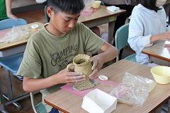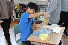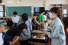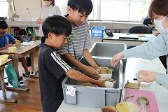 都城市文化財課による縄文時代から古墳時代までの出前授業をしていただきました。特によかったことは、教科書には出てこない都城市の縄文時代・弥生時代・古墳時代の埋蔵文化財について教えていただいたことです。菓子野小学校区には、発掘調査から竪穴式のお墓があることを紹介していただきました。お墓の中を調査していると、その時代の有力な人物の人骨や副葬品が出土するらしく、実際に手に取って子どもたちは見ていました。 また、弥生時代には、稲作の技術が伝わり、写真のような『田げた』が発掘されたことにふれ、子どもたちは複製品をはいて確かめていました。授業の後半は、縄文式土器を実際に粘土で作成する体験も行いました。貝殻や縄を使って模様を付けていました。この後は文化財課の方に乾燥と焼き上げをしていただきますので、6年生はできあがりを楽しみにしていました。