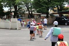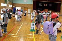 これから梅雨時期に入り、急に天候が悪くなり大雨が想定されることもあります。そこで、今日は大雨の予報が出て、子どもたちを安全に下校させるための訓練を行いました。まず、先生方で集団下校になった経緯とこれから安全に下校させるための確認を行い、学級で児童に説明を行いました。学級では、「川や用水路に近づかない。」「前が見えるように傘をさす。」など指導を行いました。登校班長は1年生を迎えに行き、1列で静かに移動しながら、地区別に体育館に集合しました。その後、人数確認や集団下校における全体指導をしました。地区の担当教師と地区にある危険箇所の確認も行いました。最後に、集団下校の引率をしながら、水がたくさん出る場所を確認することができました。来年度は、自分たちでは帰ることができない場合に保護者への引き渡し訓練を行う予定です。