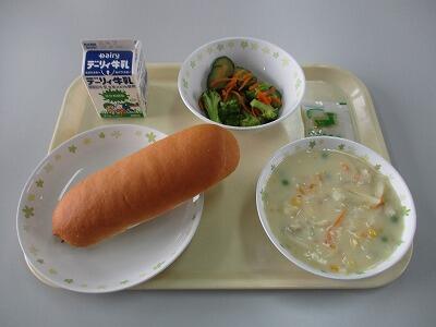 今日のメニューは、コーンポタージュ、ブロッコリーのサラダ、コッペパン、日向夏みかんジャム、牛乳です。