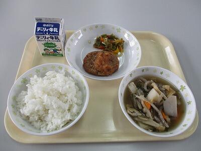 今日のメニューは、ハンバーグおろしソース、ピーマンソテー、けんちん汁、白ご飯、牛乳です。
