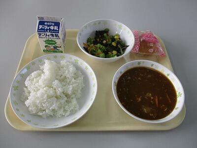 今日のメニューは、さわらのカレー揚げ、ミニトマト、大根葉のみそ汁、白ご飯、牛乳です。梅雨の晴れ間となりました。教頭先生が一生懸命草刈りをしておられます。おいしい給食で疲れもふきとぶことでしょう!?