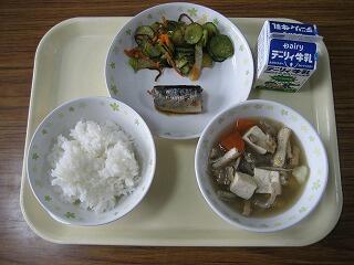 本日のメニューは、ご飯、牛乳、さんまかぼすレモン煮、白菜の塩昆布和え、けんちん汁でした。