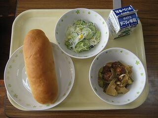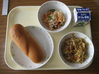 本日のメニューは、減量黒糖パン、牛乳、切干し大根入り焼きそば、かみかみサラダでした。