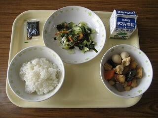本日のメニューは、ご飯、牛乳、鉄ひじきのり、おでん、酢味噌和えでした。