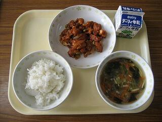 本日のメニューは、ご飯、牛乳、県産真鯛のソースがらめ、春雨スープでした。