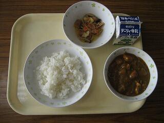 本日のメニューは、ご飯、牛乳、チキンカレー、きのこソテーでした。