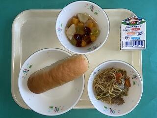 今日の給食:9月26日(金) メニュー【切り干し大根入りの焼きそば、フルーツカクテル、減量コッペパン、牛乳】