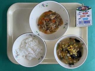 「回鍋肉:ホイコウロウ」は、「回る」「鍋」「肉」と書きますが、この「回る」とは中国語で帰るとか戻るという意味です。昔は、豚肉の塊のままでゆでて、保存していたそうです。その肉を使うたびに、スライスして中華鍋で野菜と炒めて食べていました。ゆでた肉をもう一度鍋に戻して炒めることから、この名前がついたそうです。給食の「回鍋肉」は、新鮮な豚肉と野菜がたくさん入った炒め物です。トウバンジャンのほどよい辛みで食が進みます。