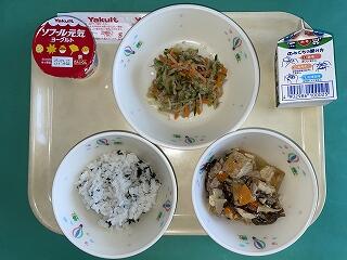 今日の給食:9月9日(火) メニュー【厚揚げの中華煮、もやしナムル、元気ヨーグルト、わかめごはん、牛乳】