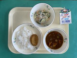 今日の給食:9月2日(火) メニュー【野菜カレー、キャベツのサラダ、枝豆と豆腐のミンチカツ、ごはん、牛乳】