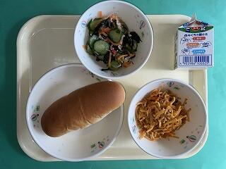 今日の給食:12月10日(水) メニュー【切り干し大根入りのスパゲッティ、海藻サラダ、減量コッペパン、牛乳】