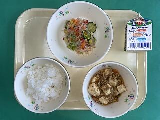 今日の給食:6月2日(月) メニュー【マーボー豆腐、春雨サラダ、ごはん、牛乳】