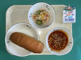 今日の給食:10月1日(水) メニュー【ポークビーンズ、日向夏ドレッシングサラダ、ミルクパン、牛乳】
