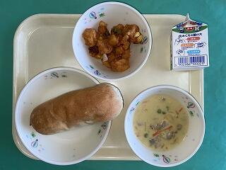 今日の給食:3月13日(金) メニュー【魚とさつまいものオーロラ和え、コーンポタージュ、米粉パン、牛乳】