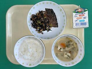 今日の給食:7月4日(木) メニュー【ひじきの炒め煮、みそ汁、ブリ照り焼き、ごはん、牛乳】