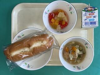 今日の給食:6月13日(金) メニュー【キャベツのスープ煮、フルーツカクテル、卵不使用マヨネーズパン、牛乳】