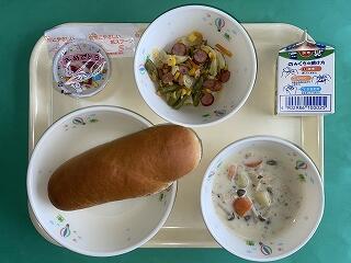 今日の給食:3月19日(水) メニュー【キャベツのソテー、チキンチャウダー、おめでとうゼリー、ごはん、牛乳】
