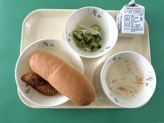 今日の給食:9月12日(金) メニュー【コーンポタージュスープ、グリーンサラダ、白身魚フライ、コッペパン、牛乳】