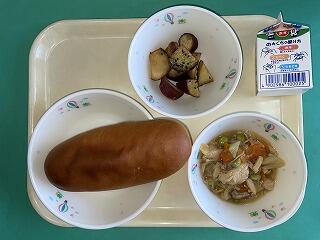 今日の給食:2月14日(金) メニュー【鳥肉の八宝菜、大学芋、黒糖パン、牛乳】