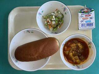 今日の給食:9月19日(金) メニュー【ミートボールのトマト煮込み、青豆とチーズのサラダ、ミルクパン、牛乳】