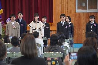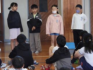 発表の冒頭では、乙房奴踊りの三味線を披露しました。そして、これまで地域や卒業生の方によって受け継がれてきた「乙房奴踊り」の伝統を守るために、姉や先輩の影響もあって4年生から民俗芸能伝承研究会の所属し、地域の方に指導を受けながら三味線の練習を行っていること、友達と声を掛け合い、助け合いながら練習に取り組んでいること、奴踊りの発表が終わった後の充実感や指導をいただいた地域の先生方、家族への感謝の気持ち、卒業まであと少しであるけれど、自分が4、5年生に伝えていくという決意を述べました。
